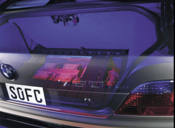 Photo: BMW Munich, Germany - After less than two years development time, the BMW Group presents the first car in the world whose on-board electrical power is supplied by a gasoline operated fuel cell (SOFC). The new type of fuel cell battery can be used in every conventionally operated automobile, reduces fuel consumption and permits a whole range of new safety and comfort functions. The energy system, which was developed together with Delphi Automotive, will be featured in coming BMW model generations as the so-called APU (Auxiliary Power Unit). The BMW Group is the world's leader in the development of fuel cell APUs for on-board power supply. Several of the small-series-production, hydrogen-powered 750hL models are already equipped with such a fuel cell APU featuring PEM (Polymer-Electrolyte-Membrane) technology. SOFC fuel cell: effective, robust and reasonably priced The new fuel cell is a so-called "Solid Oxide Fuel Cell", SOFC in short. In this solid fuel cell, hydrogen is converted into electricity at approx. 800° C via zirconium oxide ceramics. In a start and a main reformer, gasoline is evaporated and hydrogen is split off also at 800° C operating temperature. The hydrogen then reacts with the oxygen from the air, which is supplied by a fan. In the process electricity is generated and water is produced as a by-product. Non-reacted residual gas is combusted. The heat produced in this way serves to heat the air required for the reaction and the reformer, which improves overall efficiency even further. It is not only this short process chain which makes the SOFC cell so ideally suited for operation in conventionally powered gasoline cars. Compared to the currently generally favored PEM fuel cell (polymer electrolyte membrane) the SOFC is also a lot less sensitive to impurities which are produced in a gasoline reforming process since CO can also be converted into electricity and not only hydrogen. In addition, it does not require expensive precious metal electrodes. Efficiency has been doubled compared to conventional concepts. The task of the SOFC fuel cell unit for BMW passenger cars is to supply the vehicle electrical system with electrical energy. This "electrochemical powerplant" is to take over the function it does best: to generate electricity with a high degree of efficiency - independent of the engine. The conversion of gasoline into electricity via SOFC fuel cell is almost twice as efficient as the combination of engine, alternator and battery. For driving the car itself, the view held by BMW is that the internal combustion engine offers more benefits. The autonomous operation of the fuel cell APU makes possible new functions: windows can be defrosted before getting in the car, seats and steering wheel can be warmed. In high outside temperatures the air conditioning can be operated optimally regardless of the engine speed. Air conditioning the car with the engine off can already be carried out using a quarter of the energy required today. With today's level of electrical consumption in a vehicle, approximately one liter per 100 kilometers of fuel can be saved in city traffic. Future "by wire" systems such as electrically operated steering or brakes require far more electrical energy which can then be efficiently provided by the SOFC fuel cell. The use of Internet and online services in the car and the "mobile office" are facilitated considerably by fuel cell APU technology. The APU developed by BMW is ideally suited for the new 2-voltage electrical system. Existing APU vehicles not only supply the conventional 12 V system, but also the newly developed air conditioning system with 42 volts. APU to be available in a few years: customer benefit with no compromises The BMW Group wants to offer the fuel cell APU and the benefits involved in approx. five years. This means that BMW customers will be the first to benefit from specific advantages of fuel cell technology without any compromises involved. The aim of series development, which has already begun, is to reduce the size and optimize the overall system even further. Output will be approximately five kilowatts for which the reformer is already designed today. The compact fuel cell battery will only require approx. the space of a conventional lead battery in the future. However, the fuel cell surpasses the power and "endurance" of the lead battery by far. In the long term the fuel cell might even substitute the electric generator in the car. With the APU, a new era will begin for the automobile whose electrical power needs are ever-increasing. (Feb. 16, 2001) [Homepage] [