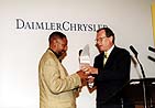 Stuttgart – Themba Mkhize is this year’s winner of the DaimlerChrysler Award for South African Jazz. Mkhize will receive the award on May 10, 2001, from DaimlerChrysler CEO Jürgen E. Schrempp at the Mercedes Event Center in Sindelfingen, Germany. The award ceremony is part of a reception that Schrempp is hosting in his capacity as Honorary Consul General of the Republic of South Africa on the occasion of the country’s national holiday, "Freedom Day." Mkhize and his band, "Themba Mkhize & Friends," will also perform at the ceremony. The seven-member jury consisting of internationally renowned experts, including Darius Brubeck, Peter Herbolzheimer, Sibongile Khumalo, James Morrison and Clark Terry, met from November 27 – 30, 2000, in Johannesburg to select the 2001 winner. In explanation of its decision to award the prize to Mkhize, the jury stated that the award winner is a musician whose work stands for both South African jazz and jazz music in South Africa. The DaimlerChrysler Award, which is endowed with DM 100,000 in prize money and other forms of support, was established in 1999. As a sponsoring project, it plays an important role in DaimlerChrysler’s support of culture. The aim of the prize is to honor and promote the cultural achievements of a country in terms of its general social and political development and maturity. Behind the DaimlerChrysler Award is also the idea that talented, up-and-coming artists from all of a country’s artistic and cultural fields should be supported, thereby boosting their national and international reputation as well. The award currently focuses on South Africa. In his speech, Schrempp emphasized DaimlerChrysler’s commitment to southern Africa: "We’re involved in the region because we know that our company and our employees profit greatly from the worldwide convergence of markets, a precondition for ensuring profitable growth and an increase in value over the long-term. I am certain that if everyone pulls together, there can be a bright future for southern Africa, and indeed for Africa as a whole. And we are obligated to help." Turning to the artist, Schrempp offered a very simple explanation as to why the jury selected Themba Mkhize for the award: "Because your music has mesmerized us." The award is meant to promote various stages of personal and artistic development as well as the career of the award winner. In addition to the prize money, which is intended to serve as a basis for further development, the artist is also given the opportunity to present his or her work at a large venue — both in Germany and in the artist’s home country. Depending on what type of art or cultural endeavor he or she is involved in, the artist can use the award to organize a traveling exhibition (as did last year’s winner, Kay Hassan) or present a series of concerts, as Themba Mkhize intends to do. Next year’s prize will be awarded to a sculptor. Themba Mkhize recently recorded a new CD, the mastering of which was made possible by the DaimlerChrysler Award. "Lost and Found," which combines traditional forms of South African music with jazz elements, will be presented to the public for the first time on the evening of May 10. Following his appearance in Sindelfingen, Mkhize will perform a further four times during the spring tour of the BuJazzO (the Youth Jazz Orchestra of the Federal Republic of Germany) as part of the DaimlerChrysler Award. The dates are May 15 in Kehl, May 16 in Montabaur, May 17 in Georgsmarienhütte and May 18 in Worms. Mkhize will also take part in the BuJazzO’s late summer rehearsals from September 9 – 20 in Altegolfsheim near Regensburg. (May 10, 2001) [Homepage] [