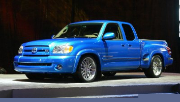 Tundra Stepside Concept Photo: Toyota CHICAGO - The world debut of the all-new Toyota Stepside was staged at a press conference at the Chicago Auto Show. The Stepside is a show truck version of a new addition to the Tundra lineup that will arrive at Toyota dealers this fall. It is a collaborative effort between Toyota Motor Sales (TMS), U.S.A., Inc., Toyota Motor Corporation of Japan and Toyota Racing Development (TRD). "The Tundra Stepside concept explores the possibilities of broadening the Tundra product line and will show consumers that ruggedness and utility can go hand-in-hand with style and image," said Don Esmond, Toyota Division senior vice president and general manager. The Stepside show truck was designed to reach out to full-size pickup buyers who want to add a little flair to their trucks. It houses the sophisticated 4.7-liter i-Force V8 engine that delivers 240 horsepower and 315 lbs.-ft. of torque. The concept is based on the Tundra Limited Access Cab and is dressed in a brilliant blue exterior paint. What sets this Tundra apart from the rest is the addition of a stepside bed with distinctive tail lamps. The tail lamps pull back over the rear wheel arches for a sleek appearance. The stepside interior bed width between wheelwells and the bed length remain the same as a regular Tundra bed, while bed depth has been increased from 17.2 inches to 19.0 inches. The stepside bed was built at Toyota Motor Manufacturing in Princeton, Indiana (TMMI). The show truck also features a redesigned front fascia with a grille that extends down into the front bumper and round fog lamps for a bolder, more aggressive look. Color-keyed overfenders give the vehicle an eye-pleasing, monotone look from any angle. The Stepside owes its powerful stance to a sport suspension package that lowers the vehicle from the stock Tundra by about four inches and includes unique shock absorbers, sport-tuned suspension and rear stabilizer bar. Road-gripping BFGoodrich g-Force T/A KDW tires are wrapped around brawny three-piece chromed alloy 20-inch HRE Performance wheels. The finishing touch is a TRD Tundra dual cat-back exhaust, which adds a distinctive tone upon acceleration as well as approximately six horsepower. Inside the Tundra Stepside, style and image harmonize with comfort and convenience. Amenities include heated outside mirrors, power sliding rear window, steering wheel mounted audio controls, wood-grain-style interior trim, leather-trimmed captain's chairs and a Premium 3-in-1 AM/FM/Cassette/CD with four speakers. A multi-function center console provides 91.5 cubic inches of storage capacity and features dual front-and-rear cup holders and a double-door that includes a memo pad clip. (Feb. 06, 2002) [Homepage] [