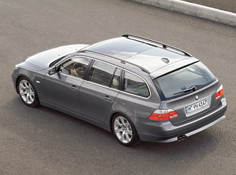Photos: BMW Get in and feel at home: The 5 Series Touring offers high-class materials in five equipment versions and with four interior colour worlds ensuring supreme comfort and refinement on the road. Two examples are the new, extra-quiet automatic air conditioning with adaptive air humidity control and the multifunctional comfort seats available as an option. And never before has the interior of a 5 Series Touring been as bright and 'breezy' as on the new model available as an option with a two-piece glass panorama roof measuring 0.68 square metres in size to give the car's passengers both front and rear a wonderful view and, when fully open, almost the feeling of driving in a convertible. Compared with the former model, the new BMW 5 Series Touring has grown significantly in virtually every respect: Length is up by 38 millimetres (1.50´´), width has been increased by 46 millimetres (1.81´´), and the new Touring is 23 millimetres (0.91´´) higher than before. In all, therefore, the new Touring measures an impressive 4.48 metres (190.55´´) in length, 1.85 metres (72.83´´) in width, and 1.49 metres (58.66´´) in height. Looking at the car from outside, however, you will hardly notice this growth in size and dimensions, short overhangs front and rear, extra-large wheels, and a wide track giving the new 5 Series both an elegant and dynamic appearance. But inside the new 5 Series Touring is another story, with up to 3 centimetres or 1.18´´ more shoulder room for the passengers, greater headroom, and 4.5 centimetres or 1.77´´ more kneeroom for the passengers at the rear. Despite this increase in dimensions both within and outside the car, and even with the wider range of passive safety features, the weight of the new Touring has not increased over the former model. On the contrary: Thanks to an innovative combination of aluminium and steel in the bodyshell - as on the Saloon - weight has even decreased, depending on the model and the level of equipment, by up to 50 kilos or 110 lb. Luggage compartment: larger, more variable, and with even better access Nobody has to get their hands wet or even dirty when opening and closing the tailgate on the new BMW 5 Series Touring. For as an option all you have to do is press a button on the key to the car and the tailgate will open and close fully automatically. At the same time, with the rear lid swinging up or when opening the rear window, the roll cover automatically moves to the front for convenient loading and unloading without requiring any additional intervention on the part of the driver or passengers. And to conveniently put in or take out small items of luggage, the luggage compartment, like on all BMW Tourings, is also accessible through the separately opening rear window. The floor of the luggage compartment is completely flat from front to rear, from one side to the other. Loading capacity ranges from 500 (535) litres (17.5/18.7 cu ft) all the way to 1,615 (1,650) litres (56.5/65.0 cu ft) with the rear seat bench tilted forward and the compartment fully loaded up to roof level. This is 90 (125) litres (3.5/4.9 cu ft) more than on the former model (figures in brackets applicable to models featuring runflat tyres and therefore not requiring a spare wheel). Taking along the family, the driver of the new 5 Series Touring is able to easily accommodate two large as well as two medium-sized hard-shell suitcases and two travel bags in his car. And as an alternative, four 46-inch golf bags also fit conveniently into the luggage compartment. Lockable for extra security, the floor of the luggage compartment can be raised up from its usual position, then remaining at any setting desired with the help of gas pressure springs (like the engine compartment lid), before being lowered once again. Beneath the floor panel the driver will then find a variable storage compartment for small odds and ends. The spare wheel, finally, comes one level further down (or, as an alternative, an additional 35-litre/1.2-cu ft luggage box whenever the 5 Series Touring is equipped as an option with runflat tyres). The luggage compartment comes as standard with a roll cover, a partition net, four lashing points and a power socket, for example for connecting an electric cooling box. Optional extras include an additional storage package with a two-piece floor panel, folding partitions preventing, say, carrier bags from falling over, lashing belts in the side panels and multifunction holders serving, for example, to accommodate your shopping bags. Split 60:40, the rear seat bench may be combined as an option with through-loading including a ski-bag. Another option is the roof railing for conveniently fastening a roof box or roof rack system carrying a roof load of up to 100 kilos or 220 lb. Entering the market in four model variants The new BMW 5 Series Touring is entering the market in the guise of the 525i and 540i, the 525d and 530d. With the exception of the refined 2.5-litre straight-six bi-VANOS petrol engine in the 525i carried over from the former model, the other three engine variants are new to the 5 Series Touring, offering a significant increase in output, torque, and performance. The 520i and 530i will be following in spring 2005. Featuring a VN turbocharger and the latest common rail fuel injection, the brand-new 2.5-litre straight-six diesel develops maximum output of 130 kW (177 bhp) from 2,497 cc and muscular torque of 400 Newton-meters or 295 lb-ft between 2,000 and 2,750 rpm. This is an increase in output by 10 kW/14 bhp and in torque by 50 Nm/37 lb-ft over the former model. Acceleration to 100 km/h in the 525d comes in 8.3 (8.5)* seconds, fuel consumption in the EU cycle is a mere 7.0 (8.0) litres on 100 kilometres, equal to 40.4/35.3 mpg Imp. Top speed, finally, is 225 (222) km/h or 140 (138) mph. Starring as a genuine power diesel, the three-litre six-cylinder develops maximum output of 160 kW (218 bhp) and supreme torque of 500 Nm (369 lb-ft)