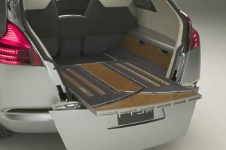 Photos: Toyota The inviting interior was created by Calty designer Alberto Palma and exudes luxury, comfort, utility, and practicality. The fresh look is achieved with natural woods, soft leathers, and durable metals. The interior features a new sense of space defined by a "60/60" feeling for the driver and front passenger. This is achieved by overlapping seat elements that create individual space giving each the impression his space is dominant. A "flying speedboard" gauge cluster surrounds the driver with a sleek, sporty design that (like the exterior) seamlessly flows into the door and around the interior. The armrests are integrated into the seats, eliminating clutter and creating a living-room effect. The rear cargo area is designed to fit every need, displaying a high level of quality and refinement. A loading tray automatically extends when the lower hatch is opened to assist in loading large and heavy objects. (January 10, 2005)