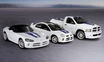 "SRT vehicles are in a class by themselves," said Dan Knott, Director - Street and Racing Technology, Chrysler Group. "These commemorative editions of the Dodge Viper SRT10, Dodge SRT4 and Dodge Ram SRT10 offer our customers even more exclusivity. And similar to all of our SRT vehicles, these will offer benchmark performance at the lowest price." Honoring more than a dozen years of outrageous street performance and championship wins, the Commemorative Edition 2005 Dodge Viper SRT10 is offered with a Stone White exterior and dual Viper Blue stripes. The interior features blue accent stitching on the shift knob and boot, parking-brake boot, steering wheel and floor mats. The Commemorative Edition package for the Dodge Viper SRT10 is priced at $4,550 over the vehicle's MSRP. Fun, affordable and fast, Dodge SRT4 is a sport-compact tuner car available right from the factory, and is the fastest production car for under $22,000. The Commemorative Edition Dodge SRT4 also features a Stone White exterior enhanced with Electric Blue stripes. Inside, blue accent stitching is on the seats, floor mats, steering wheel and shift boot. Stainless steel door-sill plates complete the Dodge SRT4 Commemorative Edition package, which is priced at $1,600 over MSRP. The Commemorative Edition Dodge Ram SRT10 features Bright White exterior paint with Electric Blue stripes. Interior enhancements include blue stitching on the seats, shift boot, shift knob and steering wheel. Floor mats are embroidered in matching stitching with the SRT10 logo. In addition, the Dodge Ram SRT10 Commemorative Edition includes standard polished wheels, brushed aluminum scuff plates, and hard tonneau cover. The Commemorative Edition package for the Dodge Ram SRT10 is priced at $4,500 over MSRP. SRT Commemorative Edition vehicles will arrive in dealerships this summer. (May 24, 2005)