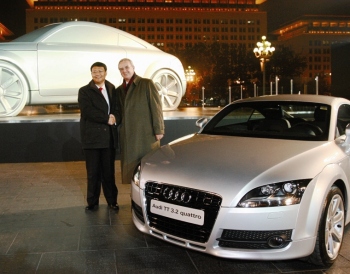 In China the dragon represents power, dynamism and joy while also being a symbol of the Chinese people. With the help of this fabulous creature, full of positive associations in Chinese culture, the brand is presented to motor show visitors in a way that appeals specifically to Chinese tastes: "In doing this, we are responding to the increasing importance of this market. At the same time, we are using the dragon panels to illustrate the essential contents of our brand," commented Bernhard Neumann, Head of International Exhibitions at AUDI AG. On one side, the panels present 50 topics. Tailored especially for China, the motor show concept is an entirely new development that is without parallel worldwide. Preparations for it began over a year ago. To precisely recognise and observe cultural differences and subtleties, dos and don'ts were identified in collaboration with Chinese people, including artists and architects. These were used to develop the unique motor show stand concept. Expressing his enthusiasm for the dragon, Mr Neumann points out, "Never before has a motor show concept been so primarily tailored for a specific target group. It is a concept for China." Ten-tonne TT sculpture unveiled at the heart of Beijing On the eve of the motor show an outsize sculpture of the Audi TT was unveiled in the heart of the Chinese capital in front of the "Grand Hyatt" hotel close to Tiananmen Square, the Square of Heavenly Peace. Some 250 invited guests, including Chinese public figures, celebrities and sports personalities, enjoyed a spectacular show. The sculpture was created for the initiative "Germany – Land of Ideas". There it formed part of the "Walk of Ideas" in front of the Brandenburg Gate in Berlin. Following a stopover at Munich Airport, it was transported to Beijing – Berlin's twin city (November 20, 2006)