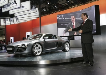 The dragon reigns supreme The dragon is the ever-present theme of Audi's display at the Beijing Motor Show in China. The Audi stand in Hall 8 is dominated by 48 light panels, each four by two metres in size, symbolising a dragon. The panels are arranged to give the impression of a dragon elegantly winding its way around and over the vehicles on show. At the dragon's head stands an Audi A6L 4.2 FSI quattro, followed by the new Audi R8 sports car, the TT Coupé and a Horch 850 Pullman Cabrio Bauer from 1936, representing the tradition of the Audi brand.