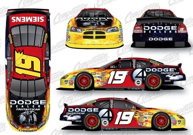 Another limited edition Dodge vehicle making its debut on May 27 is the No. 19 Fantasticar Dodge Charger of Elliott Sadler at the NASCAR Nextel Cup Series’ Coca-Cola 600 at Lowe’s Motor Speedway. The No. 19 car will feature a stunning paint scheme that showcases the ghost-like Silver Surfer shooting across the hood, while flames explode over the nose and up the fenders of the Fantasticar. The familiar Fantastic Four logo will also adorn both rear quarter panels.
