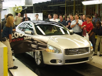 "We set out to create one of the best performing front engine, front-wheel drive sedans in the world," said Al Castignetti, vice president and general manager, Nissan division, Nissan North America. "The Maxima delivers on all levels offering the value, quality, and exhilarating performance consumers have come to expect from Nissan." The 2009 Maxima is built on Nissan's new D platform that provides responsive handling and virtually eliminates the torque steer associated with high horsepower front wheel drive vehicles. It also boasts a new Xtronic CVT (Continuously Variable Transmission) with manual mode, tuned specifically for Maxima's sporty driving character. For drivers seeking the utmost in vehicle control, a new "Ds mode" (drive sport) has been added to the CVT for 2009. "Ds mode" is an electronic control logic that enhances sport driving through increased acceleration feel with higher engine revolutions, automatic engine braking, and maintaining engine speed during cornering. The Maxima's 3.5 liter DOHC 24-valve VQ series V6 engine is now rated at 290 horsepower and 261 lb-ft of torque, increases of 35 horsepower and 9 lb-ft of torque over the 2008 Maxima. All of the engines for the vehicle are produced at Nissan's Decherd, Tenn., Powertrain Assembly Plant Fuel economy is estimated at 19 miles per gallon city, 26 miles per gallon highway, similar to that of the 2008 Maxima despite the additional horsepower. The all-new 2009 Maxima will be offered as two well-equipped models, Maxima 3.5 S and Maxima 3.5 SV, and is scheduled to arrive at Nissan dealers nationwide in early summer 2008. Pricing will be released closer to start of sale. The Maxima was first introduced to the U.S. market in 1981, essentially creating the mid-size import sport sedan category. Four out of five of all Maximas sold are on the road today. "The Maxima represents Nissan's ongoing commitment to quality and long term durability," Daniels said. "The new generation Maxima will live up to its legacy." In calendar year 2007, Nissan North America sold 52,574 Maximas. The vehicles are also exported to Canada, Mexico, Puerto Rico, Guam, and Saipan. In fiscal year 2008, Nissan will export approximately 3,600 Maximas. Since production of the Maxima moved to Smyrna from Japan on Jan. 21, 2003, the plant has produced 384,303 units as of May 15, 2008. The Smyrna plant employs approximately 5,650 people and represents an investment of $2.1 billion. In addition to the Maxima, the plant produces the Nissan Altima mid-size sedan, Nissan Altima Hybrid sedan, Nissan Altima Coupe, Nissan Xterra SUV, Nissan Pathfinder SUV, and Nissan Frontier pick-up truck. Photo: Nissan (May 27, 2008)