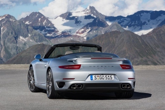 While the rear-axle steering has an immensely positive impact on handling for the two new super sportscars, both on the racetrack and during everyday use, the active aerodynamics can be tuned to offer optimum efficiency or driving dynamics at the touch of a button, depending on the driver's wishes. More than ever before, both of these new top-of-the-range models also make a clear visual statement about their performance. The characteristic, widely flared rear wings of the new 911 Turbo generation are 28 mm wider than those of the 911 Carrera 4 models – a virtually level surface of just over a hand's width extends out from the C-pillar to the outer edge of the vehicle. The impressive effect of this width is accentuated still further when the top is down. Another eye-catching feature of the 911 Turbo Cabriolet is the exclusive Porsche panel bow top with its lightweight magnesium frame. This innovative technology enables the Coupé-like arch to the roof to be achieved when the top is closed. This arch, which also offers advantages in terms of aerodynamics, is not feasible using conventional construction techniques. As with predecessor models, the roof opens and closes in around 13 seconds, at speeds of up to 50 km/h. Premium furnishings in the interior The interior of the new Cabriolet models follows that of the 911 Turbo Coupé. The S-model boasts a particularly extensive range of furnishings, with features including an exclusive interior in Black/Carrera Red and adaptive Sport Seat Plus seats with 18-way adjustment and memory. In addition, the backrest shells of the seats are leather trimmed with double cap seams, and various elements are achieved in a carbon look. As with the predecessor models, the Bose sound system is fitted as standard – and, for the first time, a Burmester system is also available on request. What's more, the radar-controlled adaptive Cruise Control system, camera-based road sign and speed limit recognition function and reversing camera are also available as options. The new top-of-the-range 911 Cabriolet models will be launched onto the market in December 2013. In Germany, the 911 Turbo Cabriolet costs EUR 174,431 and the new open-top 911 Turbo S EUR 207,989, inclusive of VAT and country-specific equipment in each case. 1) 911 Turbo and 911 Turbo S: urban fuel consumption: 13.2 litres/100 km; extra-urban fuel consumption: 7.7 litres/100 km; combined fuel consumption: 9.7 litres/100 km; CO2 emissions: 227 g/km. 2) 911 Turbo Cabriolet and 911 Turbo S Cabriolet: urban fuel consumption: 13.4 litres/100 km; extra-urban fuel consumption: 7.8 litres/100 km; combined fuel consumption: 9.9 litres/100 km; CO2 emissions: 231 g/km. Photos: Porsche (Sept. 26, 2013)