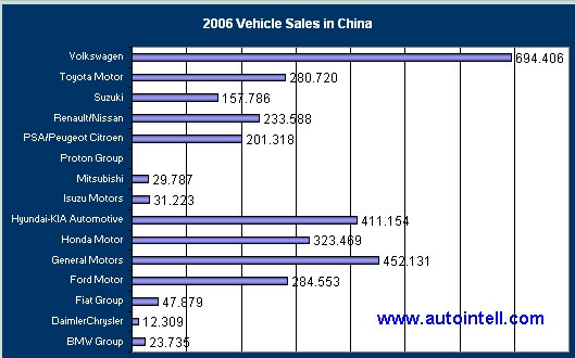 Joint Venture Companies in 2006 In 2006 Volkswagen was the strongest foreign car maker in China. Its early engagement of 1982 paid off. General Motors and Hyundai-Kia established a significant market share. Hyundai recently (August 07) announced its plans to increase car sales to 600.000 units by 2008. Daimler and Chrysler still have a weak footprint in the market, which might change once Chrysler is finding its new identity.