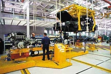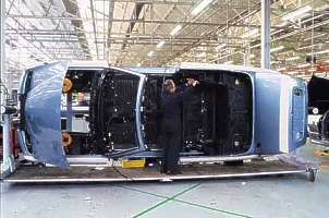 A computer-controlled Hemming press is an important addition to the Body Assembly Hall. This can do in 12 minutes what would once have taken a day. Loaded and operated by a four-man team, it presses outer skins onto hinged components - doors, boots and bonnets - at up to 100 tonnes. The skins are glued rather than welded, to be set in an oven no hotter than a hair drier. Two hundred and ten "closures" can be completed each week by the team.