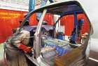 Everything here is done by hand, from attaching the 240 individual copper and other metal studs used in the floor pan to hold the wiring looms and carpeting in place, to applying the sealant which will later be baked in the oven. Between 540 and 560 components are used to construct each body. By the time each one leaves the assembly hall, it will incorporate some 3m of MIG wire, 1.5m of brazing, and about 200 nuts.