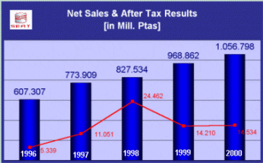 One of the priorities of the company is investment in research and development with the objective of offering innovative products of the highest quality. In the company's dedicated technical centre 2.000 people work daily in the development of new SEAT models. The SEAT Martorell (Barcelona) plant, opened in 1993 by King Juan Carlos, is one of the most efficient in Europe thanks to its advanced logistical systems and flexibility of production. 1998 saw the best ever daily rate of production achieved as the plant reached a peak of 2.250 vehicles per day with an average of 60 cars per employee per year - one of the highest rates in Europe. By the end of 1998 SEAT had 14.000 employees and a network of 3.000 dealers throughout the World. In the last year the company produced 500.500 units, sold 432.000 vehicles, achieved a turnover of 827.000 million pesetas and made a profit of 24,462 million pesetas, setting major new financial records.