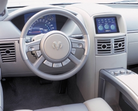 The lightweight body makes use of another DaimlerChrysler innovation - injection-molded thermoplastic technology that achieves significant improvements in weight and cost. The ESX3 weighs in at just 2,250 pounds (1020 kg) while meeting all federal safety standards and providing the roominess and comfort of today's family sedan. The entire vehicle is more than 80 percent recyclable. A total rethinking of the car's electronic and electrical systems cut several pounds from the weight of electronics while providing an ergonomically satisfying system of driver controls, vehicle monitoring and diagnostic indicators, high-performance audio and video systems, and a state-of-the-art telematics package.