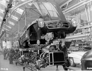 Although there were initially no plans to send the 300 SL into series production, the Daimler-Benz Board had been left with the words of Maximilian (“Maxi”) Hoffman ringing in their ears. The official importer of Mercedes-Benz cars into America campaigned tirelessly for a sports car to offer his well-heeled clientele, and the 300 SL racer fitted the bill perfectly. After lengthy deliberations, the green light was given for series production of the road-trim 300 SL (W 198), as well as a smaller, open-top sports car, the 190 SL (W 121). The two models were due to celebrate their premieres less than six months after the Board had granted the project their approval.