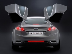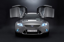 With 'kinetic design', the Ford of Europe design team has embraced the marque’s core values in an expressive, new design language. iosis expresses this language in its ultimate form. Kinetic design visualises Ford's acclaimed driving quality – it expresses energy in motion. Contributing further to these athletic, sculptural forms are the well defined wheelarch lips that have become a familiar Ford design signature since they appeared originally on the Ford Focus. Overlaid on these well defined sculptural forms are clearly recognisable graphic elements. Prominent among these is the distinctive daylight opening area with its characteristic upward tick at the rear. On iosis the new face of Ford is represented by the familiar Ford graphic of an inverted trapezoid air intake, in this case placed below a bold, chromed grille. Strongly drawn lamp graphics at front and rear are further identifiable elements with the headlamps also echoing the upward tick seen in the DLO. The precise detailing of the rear lamps and the chamfered lower corners of the rear glass combine to form another clearly identifiable graphic that defines the rear of the car. This complex surfacing and careful attention to graphic forms contributes to the tense, muscular stance of iosis. This is enhanced by precise detailing that is evident in the jewel-like featuring in the lamps and the wide, strong rocker panels. Exciting, new wheel designs with design cues drawn from the graphic elements seen elsewhere on the car are a final, vital element of the overall 'kinetic design' story. On 'iosis' this feature is expressed in a typically strong way with 20-inch wheels, milled from solid aluminium billets, featuring a contrasting polished and anodised finish that accentuates their three dimensional design. The strong sculptural forms, clearly recognisable graphic elements and fine detailing that are defined so strongly on iosis will be applied in varying ways on all future Ford of Europe models. This 'kinetic design' provides the clearly identifiable form language that will enable Ford to drive towards design leadership. Dramatic inside The interior design of iosis follows the dramatic themes of the exterior, while retaining an inviting ambience. The unique angled pivoting door arrangement gives complete, uninterrupted access to the interior, and ensures there is an instant visual link between the interior and exterior. All the sections from the instrument panel through to the centre stack and through to the console reflect the dramatic forms of the exterior. The instrument panel itself is a slim and complex form that sweeps around the front occupants of the vehicle. These forms are complemented by a selection of trim materials and colours that interprets the dynamic sporty exterior in a particularly modern way. By combining futuristic materials such as rubber and aluminium with luxurious materials, like leather, an ambience has been created that matches a technical character with sophistication. An ultra modern steering wheel fashioned from solid aluminium with contrasting orange glove leather grips and a graphite metallic leather airbag pad is matched by the Focus World Rally Car inspired sequential gear shifter. Together they embody all the themes running through the interior: contemporary craftsmanship, high quality materials and a touch of surprise-and-delight technology, with the starter button mounted beneath a flip lid on top of the shifter. The driver's cockpit is dominated by a prominent instrument binnacle housing a cluster of analogue instruments. Their chronograph precision is balanced by a high definition LCD display, reconfigurable for the navigation system or views from three rearward facing cameras. Eye-catching seats with skeletal frames featuring a ribcage and vertebrae structure are fashioned from aluminium and formed rubber. Separating the front seats is a 'flying bridge' centre console. The air vents featured on the facia and the centre console have a twist control that unfurls the vanes in a way that mimics those of a jet fighter’s afterburners. This imagery of a jet’s thrust is highlighted in the doors by aluminium inserts which flow and taper away from the vents. Neoprene is used extensively in the interior finishing in three colours: dark charcoal, "oxygen" - a metallic grey - and a strong shade of technical orange. There is also a unique leather finish that has a subtle, graphite metallic look. For the floor, conventional carpeting has been replaced with a more rugged, structured weave with technical silver highlights. Innovation iosis features a number of design innovations. The dramatic angled pivoting door arrangement features doors constructed from carbon fibre for lightness. The doors are powered by rams that swing them upwards and outwards via a system of sophisticated hinges that ensure additional support isn’t required when the doors are open. There are no conventional door mirrors on iosis. Mounted in the rear valance is a camera to complement those on each door . The exterior cameras are pieces of precisely machined aluminium, swept back to further underline the car’s visual appearance. The front lamps have an inner circular turning led for low beam with a vertical day time running light, separating it from the turn signal on the outer edge. Beneath these lighting elements are ten main beam leds, emerging when lit from tubes like a series of lasers. This look is echoed in the rear light cluster with tail lights organised in a circle with a flattened top, flanked to the outside by the indicators and inboard by the stop lights. Inside iosis, the centre stack houses docking points for a pair of memory sticks. It is possible that rather than using a conventional key or even keyless entry, a memory stick could be used that as well as acting as a security device, would also contain the driver’s personal preferences for driving position, audio settings, screen configuration, etc. Another s