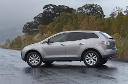 DISTINCTIVE AND SOPHISTICATED EXTERIOR Chief Designer Iwao Koizumi, whose previous works include the successful MAZDA 6 and the 1995 RX-01 showcar, names the design theme, "advanced frontier"CX-7 takes Mazda and its Zoom-Zoom image into an area it has never before ventured. Notes Koizumi, "My idea for the CX-7 design was to combine dynamic movement, speedy shapes, and a bold presence in one passionate statement. Mazda has the sports car heritage to offer a crossover SUV with a strong and distinctive appearance." SPORTY AND HIGH QUALITY INTERIOR An advanced and sporty image was pursued in designing the interior. The instrument panel consists of a unique ‘double-roof' structure, in which a small ‘roof' over the meter cluster is positioned just in front of a large ‘roof' that extends across the entire instrument panel bringing together the driver and front passenger. To draw drivers inside, there's a three-dial instrument cluster, a console supporting the shifter within close reach, three-spoke steering wheel and firmly contoured front bucket seats, all provided with a high quality feel . Koizumi emphasizes that detailed attention is given to the entire interior, including the cargo area. For the two-tone trim, the side surface two-tone graphic reaching from the front doors all the way to the cargo space stylishly harmonizes with the kicked-up beltline of the exterior side view. ZOOM-ZOOM WITH ROOM Using the innovative MX-Crossport concept shown at the 2005 Detroit Auto Show for inspiration, the chief designer mapped out the CX-7 with ample space for five occupants.The rear seat not only carries three passengers in comfort, it also splits and folds 60:40 to increase cargo capacity and versatility . BALANCE OF AMPLE POWER AND ENVIRONMENTAL PERFORMANCE - MZR 2.3L DISI TURBO ENGINE - The heart of every Mazda is its spirited powertrain. Under the hood of the CX-7 is a version of the turbocharged and intercooled 2.3-liter four-cylinder direct-injection gasoline engine that powers the highly regarded MAZDASPEED 6 sport sedan. Engineered to deliver high performance at all speeds, along with low exhaust emissions and excellent fuel economy, Mazda's MZR 2.3 DISI (Direct Injection Spark Ignition) turbo -charged engine produce s an enthusiastic 244 horsepower at 5, 000 rpm in the CX-7. DETERMINED DRIVE Advanced transmission and drive components pass the engine's power cleanly to the pavement. The six-speed Sport AT automatic transmission provides the full manual control demanded by assertive drivers. Shifts are crisp, in keeping with CX-7's sportscar character. Two drivelines are offered: Front-Wheel Drive or Mazda's Active Torque-Split A ll- W heel D rive . The latter system uses a computer-controlled coupling integrated with the rear differential to deliver up to half the available torque to the rear wheels on demand. Sensors monitor engine information, individual wheel speeds, A nti-lock Brake System ( ABS ) operation, and the CX-7's standard Dynamic Stability Control (DSC ) system to optimize torque distribution. Whether the driving conditions are dry and fast or slippery and moderately paced, exceptional handling is assured. CRAFTY CHASSIS WITH MAZDA SPORTSCAR DNA A light, stiff unibody provides the sound foundation for CX-7's smooth ride and agile handling. Computer- A ided- E ngineering analysis was used to optimize this structure, delivering high torsional and bending rigidity with minimal weight. BUILT-IN-SAFETY CX-7's rigid unibody uses the Mazda Advanced Impact energy Distribution and Absorption System to realize high levels of collision safety and helps to protect occupants i n various accident situations, including front, side and rear impacts . The body's frame sections are large in size and as straight as possible, high-strength steel is used where it's effective, and subframe connections help absorb collision energy. Stamping the side frame from a single tailored blank minimizes center pillar deformation during a side impact. ENTERTAINING FEATURES To delight, the Mazda CX-7 offers a wealth of entertainment gear. The CX-7 offers AM, FM, and CD play capability as standard . Sirius satellite radio is available as an option. To further support driving pleasure and convenience, a touch-screen D VD -based n avigation system with voice commands and a rear-view camera system are available to select as an option . In addition, buyers may choose a BOSE ® premium sound system package that includes n ine speakers, approximately 240 watts of amplification, a six-CD changer and CENTERPOINT ® surround-sound system that offers five-channel digital imaging, to create a true premium audio entertainment. THREE EDITIONS – VARIATION FOR CUSTOMERS CX-7 is offered in three trim levels. Some of the highlights of the s tandard features are manual air conditioning, power windows, power door locks, retractable key, cruise control, and six air bags. Also standard on all CX-7s is an A nti-lock Brake System (ABS), Dynamic Stability Control (DSC) and a Traction Control System (TCS). The Touring edition adds leather trim (seats, steering wheel, shift knob), power adjustment of the driver's seat, heated front seats, and a retractable cargo cover. In top-line Grand Touring trim, CX-7 is equipped with features such as leather with a black sport seat stripe, high intensity discharge ( HID ) headlamps, fog lamps, body-color mirrors, chrome door handles and automatic interior climate control. Mazda's CX-7 arrives in the North American market in the spring of 2006 as a 2007 model. (4 January 2006)