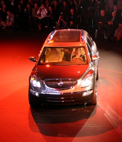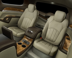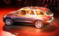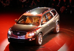 Enclave wears a Cocoa Metallic color, with the lower section of the vehicle featuring the low-gloss, chip-resistant finish expected on a luxury SUV. The unique exterior color is accented with selective chrome trim, including the door handles and the trim that encircles the side windows. Streamlined roof rack rails also are chrome, with a design that flows into the body like the other sheet metal cues. Craftsmanship is evidenced in the dramatic, jewel-like headlamp and taillamp housings, as well as the streamlined look of the roof rack rails and the visual heft of the twin, polished stainless steel exhaust outlets. Buick’s technical sophistication is evidenced in the lamps themselves: The headlamps feature HID (High-Intensity Discharge) lighting technology and are integrated with GM’s Adaptive Forward Lighting System, which enables the lamps to turn with the direction of the front wheels. The jewel-look taillamps are complemented by an LED-lit high-mounted stop lamp that is designed into the upper edge of the backlight. “It is as technically sophisticated as it is beautiful,” said Folden. “Enclave is the luxury SUV complement to Buick’s lineup of finely crafted luxury cars.” Engaging interior environment Enclave’s interior environment is designed to create a personalized experience for all passengers. Six individual, leather seats – located in three seating rows – are surrounded with thoughtful amenities and luxurious detail. The large, bronze-tinted skylight extends between the front-row seats and third-row seats, warming the interior and enhancing the feeling of openness. “Enclave has a rich, sumptuous interior that, like the exterior, reflects Buick’s precision and craftsmanship with an acknowledgement of its legacy – it’s a ‘heritage forward’ design,” said Michael Burton, interior design director. “Curvaceous forms, luxurious materials and soft, inviting colors make it a warm, comfortable environment.” The curved and round elements that permeate the Enclave’s cabin hark back to the style of classic Buicks, including the air vents, door panels and instrument panel. Brushed aluminum trim on these components, as well as features such as the pedals and gauge cluster surround reflect contemporary style and reinforce the vehicle’s craftsmanship. Aluminum-trim strips also accent the carpet of the storage compartment. These elements complement a rich-looking Cocoa and Light Cashmere two-tone interior color theme, embellished with camphor burl wood. Superior craftsmanship also is prominent in the contrasting stitching on the seats and leather-wrapped headliners. Lighting, too, was carefully selected to enhance the luxury feel while conveying warmth. A “halo” light extends from the perimeter of the skylight, while lapis blue lighting fills the footwells when the doors are opened. Tiffany-style lamps are located at the second- and third-row seats and accessory lamps are integrated as an overhead component for the second row. A Buick logo located on the inside of the power liftgate is illuminated, too. “There is a romantic, engaging feel inside the Enclave,” said Burton. “It’s also a personal environment, like that of an executive jet, with amenities that allow passengers to be more interactive during a drive.” Inventive interior amenities The front seat seatbacks have wood-embellished, fold-down trays for the second-row passengers, as well as leather, coach-style storage satchels. The three seating rows are divided by a unique console that runs from the instrument panel to the third-row seats. Each row’s console unit includes climate control switches, audio/entertainment controls, cupholders, a storage bin and jeweled, Tiffany-style analog clock. A matching clock is mounted at the top-center of the instrument panel. A rich wood look of the console contrasts with the Cashmere-and-Cocoa color theme. From the console controls, passengers also can select from a wide array of entertainment options delivered through four DVD screens. The front-seat passenger can flip down the front visor, which is embedded with technology that allows it to be both a mirror and a DVD screen, while third-row passengers can view a screen that flips up from their console. There also is a clever, movable second-row overhead vanity with two flip-down screens. The vanity and its flip-down screens – one for the left and right seating positions – can me moved fore and aft on an electronically controlled track. The vanity can be moved completely rearward for an unimpeded view out of the skylight. Each screen in the vehicle is capable of playing a different audio/video selection, giving the Enclave the capability of playing four DVDs simultaneously. Also, the dash-mounted navigation radio is capable of playing DVDs when the vehicle is parked. Enclave offers its passengers the ultimate in personalized, in-vehicle entertainment. Power and efficiency Enclave rides on a 119-inch wheelbase and is powered by a 3.6L high-feature V-6 with dual-overhead camshafts and variable valve timing. Enclave’s powerful V-6 offers one of the category’s most fuel-efficient options. The engine is rated at 270 horsepower (201 kw) and is backed by a six-speed automatic transmission. This luxury SUV also has all-wheel drive and four-wheel independent suspension. January 8, 2006