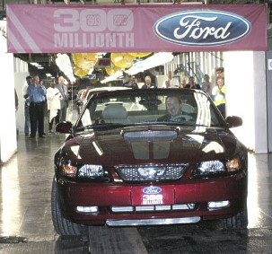 "In the 20th century, Ford Motor Company put the world on wheels with the Model T and the moving assembly line," said Bill Ford, Ford chairman and CEO. "In the 21st century, we are building on that heritage with exciting new products and innovative technology that will lead us into our next 100 years." In a ceremony at the Dearborn Assembly Plant, employees and guests cheered as he drove the 300 millionth vehicle - a crimson red 2004 Ford Mustang GT convertible - off the line. "When the company built its one millionth car, my great-grandfather Henry Ford said, 'A million of anything is a great many,'" Bill Ford said. "He would be very proud that his company produced 300 million vehicles. "We're celebrating the past, but we're building for the future," Bill Ford added. "We'll introduce 40 new products worldwide next year, including an all-new Mustang. In the next five years, we'll introduce more than 200 new products around the world." Ford also credited the extended family of Ford employees around the world and its global network of dealers and suppliers for their contributions to the 300 millionth milestone. Other vehicle production milestones in Ford Motor Company history were the 20 millionth in 1931, the 50 millionth in 1959, the 100 millionth in 1977 and the 250 millionth in 1996. Dearborn Assembly Plant is located in the Ford Rouge Center, a historically significant manufacturing complex that the company is transforming into a state-of-the-art center for advanced manufacturing. The new Dearborn Truck Plant in the Rouge Center, which begins production of the F-150 next year, will be the flagship of Ford's next-generation of lean and flexible plants. It will set world-class standards for efficient and environmentally friendly manufacturing processes. (Nov. 18, 2003)