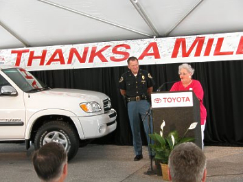 Photo: Toyota Princeton, IN - Toyota Motor Manufacturing, Indiana (TMMI) today donated a Tundra pickup truck to the City of Princeton to be used by the Princeton Police Department and committed $100,000 to Indiana University. The donations commemorate the one-millionth vehicle built at TMMI. The vehicle was lined off at 9 p.m. on June 1. "Today's donations are our way of thanking the community for its support of TMMI since the very beginning," said Okamoto, President and CEO of TMMI. "Safety in our communities and educating our youth are both very important to TMMI. This is the perfect way to show our commitment to these causes." The Police department will use the Tundra to transport its police. Indiana University will offer two scholarships per year - to a young woman and a young man. The scholarships will be for $2,500 each. The students will be from a Gibson County high school. "Indiana University is honored to receive a scholarship given by a company known for its continuing commitment to young people and to education," said Fred Eichhorn, President of the Board of trustees of Indiana University. "We are also honored that the scholarship carries the name of Governor Frank O'Bannon, a great IU alumnus and friend to the University, and a great man and public servant. We are proud to welcome the fine students from Gibson County who will be the recipients of these scholarships in years to come. IU will give them an academic home worthy of their talents and aspirations." TMMI's milestone is the result of a six-year, $2.5 billion investment by Toyota in its Princeton, Indiana operation, which has contributed to Toyota's position as one of the world's leading automotive manufacturers. (June 09, 2004)