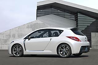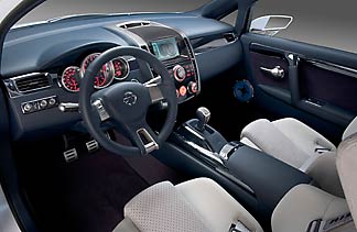 Photos: Nissan The interior of the Sport Concept is designed to fit four adults comfortably, yet with an emphasis on the front two seats - with every element of the cockpit existing to enhance the vehicle's engaging driving experience. The deep, body-wrapping front bucket seats are covered in Wolf Gray leather with double-layered pearl suede inserts and feature formed head restraints and integrated 4-point seat belts. The instrument panel includes integrated tachometer and gauges and a distinctive center cluster. The Sport Concept interior also offers a three-spoke steering wheel and solid-appearance center console with the emergency brake lever integrated into the console lid. Independent rear seats, also covered in a combination of leather and suede, offer true four-place seating with integrated 4-point seat belts. Other rear passenger features include center console-mounted support grips and a large blue-cone speaker and woofer located in the rear parcel shelf. "The Nissan Sport Concept is as close to performance art for the street as you can get - modern, cool, ready to run," said Collins. "When it comes to the next wave of small car design, a SHIFT_ is about to be made. And Nissan is making it." (March 17, 05)