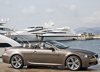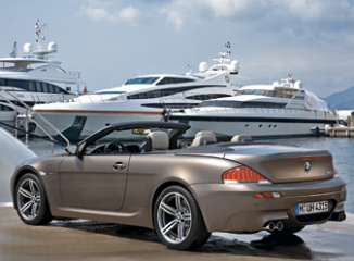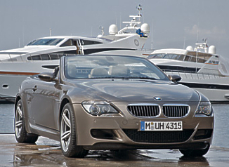 The roof of the BMW M6 Convertible is made up of three layers. A special noise- and heat-insulating layer of polyurethane (PUR) foam comes between the rubberised outer layer and the interior roof lining. Thanks to its unique fin-roof look, the softtop boasts the same dynamic contours as the coupé. The wide C-pillar, in turn, is characterised by the so-called Hofmeister "kick" proudly borne out on all BMWs and so typical of the brand. Although the roof covers an extremely generous passenger compartment, it folds up into compact dimensions, the vertically positioned rear window hardly taking up any storage space at all, since it moves up and down electrically, regardless of whether the roof itself is open or closed, thus providing a pleasant, draught-free supply of air whenever required. The roof itself opens and closes electrically either by remote control or by pressing a button in the instrument panel, the entire process in each case taking less than 25 seconds. The interior: sports car character with proud style and noblesse Within its interior, the BMW M6 Convertible again boasts a wide range of beautiful, stylish and highly practical features. Quite openly, it displays all the noblesse rightly expected by the connoisseur of an exclusive convertible ranging from generous seats and spaciousness all the way to a complete range of highly attractive comfort features. A particular highlight is the tasteful combination of the most exclusive materials, with the entire design of the interior reflecting the car's sporting and elegant style. Perfect seats for sports motoring The front seats have been optimised especially for the BMW M6 Convertible, offering above all supreme driving dynamics and excellent support. For a convertible, the space available for the rear-seat passengers is by all means comfortable and, indeed, generous. Like in all M Cars, the battery and tyre repair system are housed in the luggage compartment offering an unusually spacious volume of 300-350 litres (10.5-12.3 cubic feet). This accommodates one large and one small hard shell case or a medium-sized hard shell case plus two 46-inch golf bags. The V10 Convertible: an open pledge to power and performance Boosting a 373 kW/507 hp V10 power unit, the BMW M6 Convertible is quite literally an open pledge to power and performance. Even so, however, the sheer power of the engine alone is not everything. Rather, the fascinating experience of driving the car results from its outstanding acceleration and development of power at all engine and road speeds. In the BMW M6 Convertible, this ideal combination of torque and the overall transmission ratio translates into truly impressive power on the drive wheels in all situations and under all circumstances. The supreme performance of the fast-revving V10 power unit in the BMW M6 Convertible forms a perfect match with the optimum gear and final drive ratios, thus ensuring perfectly dosed transmission of engine power to the drive wheels at the rear. High-speed power unit and seven-gear SMG The high-speed power unit offers supreme output in all situations and under all conditions. And since fast acceleration also calls for a fast and precise gearshift, the BMW M6 Convertible comes as standard with BMW's Sequential M Gearbox (SMG) complete with Drivelogic. Seven-speed SMG conveys the power of the engine to the rear wheels ideally via the drivetrain, offering the driver the option to shift gears manually, if required with an extremely fast and efficient gearshift. At the same time the automated Drive function makes rapid but smooth cruising a particular experience in motoring comfort. SMG is activated either via the selector lever or through gearshift paddles on the steering wheel. Both in the manual and automated mode, the interruption of power flowing to the drive wheels when shifting gears is reduced to an absolute minimum. "M" for maximum muscle Perfect interaction of the V10 power unit and seven-speed SMG gives the driver maximum pleasure at the wheel: Acceleration from 0-100 km/h comes in 4.8 seconds and the BMW M6 Convertible completes the standing-start kilometre in 22.9 seconds. This supreme performance continues all the way to the car's top speed limited electronically to 250 km/h or 155 mph. Variable M Differential Lock and DSC with M Dynamic Mode The variable, speed-sensing M Differential Lock gives the M6 Convertible supreme driving stability and optimum traction especially when accelerating out of a bend. Even in the most demanding situations, therefore, the differential provides a decisive edge in traction, for example with the drive wheels running on surfaces varying extremely in their frictional coefficient. In such a case the M Differential Lock immediately builds up growing locking force with an increasing difference in speed between the two drive wheels, thus maintaining the car's traction and pulling force at all times. The BMW M6 Convertible proudly features the new generation of BMW Dynamic Stability Control (DSC). While the first stage of DSC is designed for maximum driving safety, the M Dynamic Mode is appreciated above all by the sporting driver. And it almost goes without saying that the driver is able to switch off DSC completely if he wishes. Electronic Damper Control (EDC) also offers freedom of choice, no less than three control programs enabling the driver to set the suspension to different modes ranging from really sporting and firm all the way to relatively comfortable. Clearly, the driver does not always need all the power of the V10 in every situation. In city traffic or when cruising through the countryside, for example, the comfort-oriented P400 performance program is the ideal choice. P400 is automatically activated as soon as the driver starts the engine and, as the name indicates, immediately offers 400 hp output. Then all the driver has to do is press the Power Button in order to call up the full power and dynamism of the ten-cylinder, with this e
