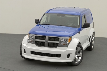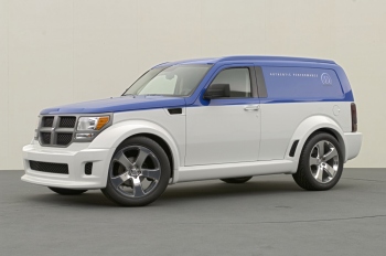 But this Nitro isn’t just about looks. The team stuffed a Mopar Performance 5.7L HEMI under the hood. Gear slamming is done through a Tremec 5-speed transmission via a Hurst pistol grip. The interior continues the no-nonsense approach with four Viper buckets wrapped in black carbon fiber leather by Katzkin. Sure to turn heads – leaving lots of long black strips on the pavement. Dodge Nitro Panel Wagon Builders: DaimlerChrysler Vehicle Build Shops 3.7L, 12-valve, SOHC V-6 210 horsepower and 235 lbs.-ft. of torque With hot rod flavor, this retro 2-door Dodge Nitro Panel Wagon also has modern flair. The Nitro Panel Wagon began as a statement about traditional hot rodding. It not only had to be a styling statement, it had to be functional, just as the speed shops did it the ‘50s and ‘60s. Modifying a standard Dodge Nitro by hand, the same way a custom car builder would. It’s Mopar-themed throughout – accessory, performance, and replacement parts The metal shop welded the rear doors shut and hand-formed the panel to fill in where the quarter and rear door glass once resided. The unique body kit accentuates its modern, masculine and athletic shape by lowering the sills and fascia. The beefy flares are one inch wider per side to cover the one-off Alcoa forged 20 x 9 wheels wrapped in sticky BF Goodrich g-Force 265/50VR20s. The suspension was lowered 2 inches to lower the center of gravity and improve the handling. Mopar’s signature blue and white was laid on the classic panel wagon two-tone scheme. The big blue space on the panel where the glass once lived begged for the Mopar Authentic Performance logo. Exterior attributes set the tone for the real story: inside. Panel vans carry cargo, and this one does it in style. Deleting the rear doors and seats creates an opportunity for unique storage systems. When the rear door is opened, the cargo floor appears to be a nice, flat area with a textured material. Upon closer inspection, a set of handles, borrowed from the production version of the Nitro, unlatch and release the 400-lb.-capacity load floor that extends a whopping 36 inches (which was created by our vehicle mock-up area). Cargo is kept from going into the front compartment by an aviation-inspired cargo net. Where the glass and quarter trim once lived, there are a set of custom panels designed to hold smaller stuff: tools, oil, filters, everything a hot rodder might need on the road. The front compartment remains in basically stock trim with the exception of the custom seats done by Katzkin, which include smooth polyurethane bolsters with a gray textured insert that mimics the cargo mat. The seats carry an embroidered Mopar logo with matching blue accent stitching. The Dodge Nitro Panel Wagon combines the essence of a classic panel van with the modern, aggressive style of today’s Dodge. With its appearance and speed shop utility, this vehicle will be greatly appreciated by any gearhead. No surfboards, flats of flowers or groceries in here. (October 31, 2006)