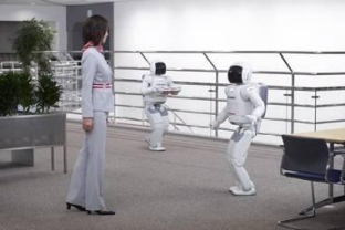1. New function to work together In situations where more than one ASIMO is required to work together, information regarding the current status of each ASIMO will be shared constantly among the multiple networked ASIMOs and share tasks in the most efficient manner. More precisely, first, the distance between the current position of each ASIMO and the site where each task needs to be performed will be calculated. Then, taking remaining battery levels into consideration, the most time efficient way to share tasks among the multiple ASIMOs will be determined. Based on this decision, each ASIMO autonomously performs its assigned tasks. 2. New function to avoid oncoming people ASIMO identifies oncoming people through its eye camera, calculates traveling direction and speed, predicts forthcoming movements of oncoming people, and chooses the most appropriate path so that it will not block the movement of others. When there is not enough space, ASIMO will step back and yield the right-of-way. 3. New autonomous battery charging function A new battery charging station was developed for ASIMO's autonomous recharging. When the remaining battery level falls below a certain level, ASIMO will automatically identify and walk to the closest available battery charging station and re-charge while standing. Photos: Honda (December 11, 2007)