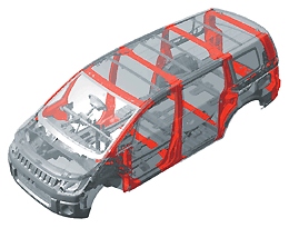 "rib bone frame" body structure, a driver SRS knee airbag