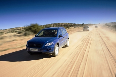 THE TIGUAN VERSIONS All engines of the Tiguan are charged. 18 and 28 degrees: Two front ends with different entry angles. All of the engine and body versions of the Tiguan have to “swallow” the dust of Namibia in this final test. Volkswagen will be offering the SUV – and this is unique so far – exclusively with charged engines. The TSIs (gasoline) output 110 kW / 150 PS, 125 kW / 170 and 147 kW / 200 PS; and the TDIs (diesel) develop 103 kW / 140 PS and 125 kW / 170 PS. The two body variants of the Tiguan differ primarily in their front ends. The “Trend & Fun” and “Sport & Style” versions are designed for a maximum entry angle of 18 degrees in front. The “Track & Field” Tiguan that is tuned even more for offroad duty can assume entry angles of up to 28 degrees with its front end. During the testing program in Africa, as however already mentioned, the emphasis is less on engines and entry angles than on final checking of the electronics and chassis.