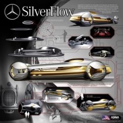 With its long, flowing lines and narrow, exposed wheels, this vision of the future is highly reminiscent of the golden years in motor racing during the 1930s. In fact the physical characteristics of the SilverFlow are even more exciting than its shape. It consists of billions of microscopically tiny metallic particles which are formed into variable but stable configurations by magnetic fields. This means that the driver can perfectly adapt the vehicle to its intended purpose. The one-seater highway configuration is extremely aerodynamic, while the city version is short and spacious. The pre-programmed vehicle variants can be selected at any time at the touch of a button, whereupon the assembler electronics reshape the car from one form to another within a few seconds – specialists refer to this as morphing. Any desired shape is conceivable in principle. As a particularly convenient feature when parking, the intelligent control system completely disassembles the vehicle structure and compacts the ferro-magnetic particles into a small, space-saving configuration. And thanks to these flexible metallic particles, dents and paint damage are also a thing of the past. The disadvantage of the Mercedes-Benz SilverFlow is that so far, it only exists as a two-dimensional graphic design. The SilverFlow study, which – if at all – will only be realizable decades into the future, clearly shows that while car designers certainly live in the present, their working environment is the future. Professor h.c. Peter Pfeiffer, Senior Vice President Mercedes-Benz Design: "The Los Angeles Design Challenge is certainly a creative challenge with this futuristic concept. The SilverFlow reflects our successful motor sports history, while boldly suggesting innovative solutions for the individual mobility of coming generations." Mercedes-Benz has established Advanced Design Studios in the USA, Japan, Italy and Sindelfingento look well into the future and engage in stylistic research for the cars of tomorrow. The task of the designers is above all to be receptive to current signals from other cultures and incorporate these into Mercedes-Benz design. Photos: Daimler (Nov 16, 2007)