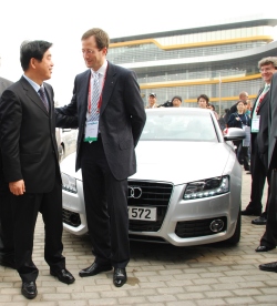 This achievement was squarely attributable to the technology that makes the TDI the cleanest diesel in the world – its ultra low emission system. Though the Audi A5 was entered in the Prototypes category in Shanghai, this system is virtually ready to go into production: the Audi A4 and Audi Q7 will be the first car lines to feature the 3.0 TDI with ultra low emission system, due to go on sale in 2008 in Europe and the USA. Various engine measures optimise the combustion process and with it the untreated emissions; an exhaust after treatment system cuts nitrogen oxide emissions by up to 90 percent. The new high-tech TDI engines already comply with the emission limits that will probably apply in Europe from 2014, and satisfy the toughest emission limits in the world – the LEV-II BIN-5 standard that applies in five US states. The Audi A3 Sportback 1.9 TDI e demonstrated in the Michelin Challenge Bibendum just how efficient the standard TDI models of the brand with the four rings already are: its consumption was clocked there at an average of 3.78 litres per 100 kilometres. Audi presented the prototype A6 Avant 2.7 TDI, with yet more near-series technology on board in the form of two intelligent energy management modules. A microhybrid recovers energy during braking and freewheeling, and a start-stop system switches the engine off at traffic lights. The V6 diesel that propels the large Avant with 132 kW (180 bhp) of power thus achieved an excellent average fuel consumption of 4.68 litres per 100 km. The Audi A5 3.0 TDI with ultra low emission system achieved a reading of 5.79 litres/100 km. In view of its very dynamic performance, this too is an excellent figure. Photo: Audi (Nov. 22, 2007)