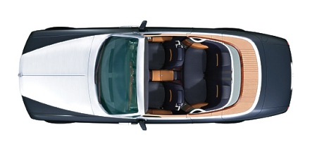 The chosen interior wood veneer is figured mahogany. Upholstery and trim are in rich Dark Curzon leather, while the flooring features the same bleached teak decking as the tonneau cover for the folded hood.