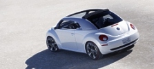 Where they start, Ragster’s newly styled, correspondingly flatter exterior mirrors are located. Every child recognizes the Ragster from the front as the New Beetle. But it also realizes that this one somehow looks different. More character? If that’s at all possible. More speed? Okay. Sure, the hood is as it always was. The headlights have a new design, they’re more oval shaped and succinct. Below now there are very flat, wider turn signals as part of the new front. With three large cooling air vents. Anyway: The car’s front drives through the wind like an arrow, adding to the car’s power and masculinity. Newly designed tail lights with completely modified technique, more oval shaped than circular, are part of the clearly contoured bumpers. The overall sportive character of the study is emphasized through a chromium plated double pipe end muffler which, by the way are already available as Real VW parts. The New Beetle Ragster is a 2+2 seater. Its newly designed sports car bucket seats ergonomics are very good. Its quilted pattern visually emphasizes that the concept of the New Beetle is focused on the driver. The center console between the seats is also new and features the same color as the body. Parts of the instrument panel, the door linings and the leather racing car bucket seats are colored in “6 pm” which for the first time was featured in the study Concept R. The new sports car steering wheel is also the same ultra dark brown color. The engineers and designers integrated into the valence not only the ragtop control switch but also the startstop-button for the engine. In addition, the round air exhausts received chromium rings. The back two seats are retractable and when folded become one cargo area colored in the body color. It is perfect for transporting a „Fender“ guitar and an amplifier to sessions or concerts or for just stretching your legs or storing wet bathing suits. The story with the legendary Fender is not coincidental: The designers, when creating the cargo area, actually did think of being able to perfectly store music equipment in this clean designed space. From the side the noticeable and in case of its serial production ideally made of brushed aluminum roof rail is staged. It frames the ragtop, flows in a harmonious line to the back part and exhibits its most succinct C-pillars. Beneath follows the coolest design of side windows of the year. Frame less, completely retractable. All the way at the bottom the fenders of the study show the newly designed wheel housings. They’re rim is straight and steep softly leading into the rounded shapes of the fenders. The ragtop can be opened and closed electronically (using a flip switch built into the steering wheel). When the top is lowered you get the real convertible feeling, especially since the side windows as shown are fully retractable and in a serial model the rear window would also be removable. The window is part of the tailgate known from the classical New Beetle which is put to practical use in the Ragster. Practical, because behind it is a noble and spacious cargo area featuring the qualities of a pick-up.