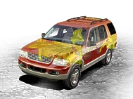 A sophisticated new all-aluminum V-8 engine brings 240 horsepower, an increase of 25 horsepower over the previous V-8. Inside, Explorer's passengers have more room to spread out. The passenger compartment is two inches wider compared with the previous model and, for the first time, has an optional third row of seating - enough overall room to accommodate seven adults. These benefits were made possible by Explorer's 2.5-inch wider track and efficient packaging of the new independent rear suspension. The second- and third-row seats also fold down to create a flat-surfaced cargo area. Additional storage is located beneath the rear cargo floor. Explorer offers one of the most comprehensive safety and security packages available. This includes Ford's new industry-leading Safety Canopy, which includes side-curtain air bags (available at launch) and rollover protection (available later in 2001). Package and Ergonomics Access to Explorer's new third-row seat is made easier with one-handed controls that fold the second-row seat completely out of the way for entering or exiting the third row. In seven-passenger models, the second-row seat is split 40/20/40. This configuration offers ease of access to the third row and the ability to customize the cargo area for long or odd-sized items. In addition, small items easily can be loaded through a new rear liftglass, which has been designed to allow a liftover height that is virtually identical to that of a shopping cart for easier loading of groceries and cargo. The liftglass section no longer needs a handle to open. It opens with a touch of a dedicated button on the key fob, while leaving the passenger doors locked. Ergonomics and functionality are at the heart of many of the vehicle's design features. For example, full-grip exterior door handles replace the former fingertip paddles - to aid ease of use for all passengers. Optional running boards are wider to provide a confident step-in point. Inside, the most frequently used controls, such as radio buttons, are in the driver's line of sight. Likewise, the optional electronic message center is mounted high, for ease of use. Even the coat hooks have been redesigned to accommodate wider, plastic clothes hangers. Driving Dynamics Explorer's new fully independent suspension and exceptionally stiff frame - 350-percent stiffer than the previous model without compromising safety - give it firm, responsive road manners. In abrupt maneuvers, such as dodging a pothole or making a sudden lane change, Explorer is designed to track precisely, without excessive body roll. The independent rear suspension soaks up road imperfections better than traditional solid axle designs, to provide a comfortable, more car-like ride. The rear-end differential in Explorer's independent rear suspension is mounted high in the frame rather than bolted below it. The suspension's upper and lower control arms also are mounted above and below the frame. The right and left rear half-shafts pass through a porthole in the frame rails - giving Explorer its "porthole-in-frame" design. Together, these solutions allowed engineers to add the new suspension system without raising the ride height while improving the vehicle's 4x4 ground clearance. All four wheels are controlled by coil-over-shock assemblies that are isolated from side loads, and are engineered to reduce unsprung weight - for best response to steering input and road surface irregularities. Off pavement, Explorer's optional Control Trac™ four-wheel-drive system has been refined with stand-alone electronic controls and enhanced software strategy that improve its ability to handle rough or loose surfaces, such as back trails, deep snow or sand. The system gives drivers the option of automatic four-wheel drive or push-button, switchable, four-wheel "high" and four-wheel "low" settings. Explorer comes with a choice of two engines. The standard engine is an improved 4.0-liter SOHC V-6, which generates 210 horsepower and 250 foot-pounds of peak torque. A more powerful 4.6-liter V-8, with all-aluminum construction and overhead-cam design, is optional. The sophisticated engine, with coil-on-plug design, offers 240 horsepower and 280 foot-pounds of torque - and is designed to go 100,000 miles before its first scheduled tune-up under normal driving conditions with routine fluid and filter changes. Both engines meet Low Emissions Vehicle (LEV) standards. Fuel economy has been held constant - even with a larger vehicle and one that can seat two more passengers than the prior model - thanks to several weight-saving innovations. An all-aluminum hood and V-8 engine block as well as a magnesium cross beam contributed to a 90-pound weight savings. Later in 2001, Explorer will offer flexible fuel capability with the standard 4.0-liter V-6 engine and automatic transmission. The Explorer flexible fuel vehicle (FFV) can operate on gasoline or a blend of gasoline and ethanol. The use of E85 fuel reduces carbon dioxide emissions by as much as 20 percent, compared with gasoline. Towing capability comes built-in. The standard receiver hitch, which is part of the rear frame, offers Class II towing capacity of up to 3,500 pounds, depending on engine and drivetrain. A built-in hitch receiver offers towing capability right from the factory and can accept many accessories, such as a bicycle rack. An upgraded towing package, which includes a limited slip rear differential, provides Class III/IV towing capability of up to 7,300 pounds. Safety, Security and Convenience Explorer is Ford's first SUV with new side-curtain air bags. They deploy from the headliner across approximately 75 percent of the side glass area to help protect first- and second-row occupants in the outboard seating positions during a side-impact collision.