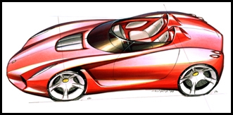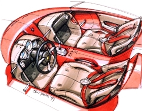 Photos: Automotive Intelligence The lighting clusters, on the other hand, mark a distinct change of direction: at the front a slash over the crest of the wing, at the rear a double cavity that evokes the high set exhausts of Ferrari's current Formula 1 cars. The two clearly outlined roll bars are linked by a transverse fin that serves a dual purpose since it houses both the leds of the third stop light and a pair of cameras. The function of the camera facing the rear is self-evident: it replaces the rear-view mirror by delivering picture signals to the LCD screen on the central console. The second camera on the other hand, is focused on the driver and is connected to the on-board video-recording system. In this way it provides the driver with his own in-built camera car and enables him to create a video library he can access for memories of open car driving and its joys on those dark, wintry days when he has to leave his two-seater spider in the garage. The Sides It has taken Pininfarina just a few decisive pencil strokes to endow the Rossa with a profoundly meaningful sideview. The crest of the wing tapers as it approaches the cabin to create the base line for the slender swoop of glazing along the side. The result is a flowing solid section to set against the vacuum left by the front wing which is so deeply recessed that it merely forms a lid for the engine bay. This subtle balance between plenitude and vacuum is interrupted by the fin that rises from the sill to frame the front wheel: a contemporary interpretation of a key design feature from the 1958 Testa Rossa. That fin is a decorative element which also houses a functional component in the form of the direction indicator flasher. In side view the Rossa revives a surface treatment last seen on the Mythos but is here extended along the entire body of the car which seems to be wedged into a much wider bonnet. The modeling of the sides is a subtle interplay of softly moulded surfaces bordered by sharp angles which might be described as a biodesign reinforced by visible ribbing. The slender flow of the glazing completes the overall design without disturbing it, the only interruption being provided by the two roll-bars that crouch over a tail-end that slopes gently downwards. The Front The nose of the Rossa incorporates a classic Ferrari radiator grille, its blunted trapezoid shape embellished by the prancing horse motif at the centre and a rectangular grid with big air intakes serving the brakes and engine bay at each end. In other words, however totally different in form and function, the three key elements that have featured on all recent Ferraris. On this particular car, the planes into which these apertures are carved are forcefully characterised: the centre of the nose protrudes to transform the radiator grille into a shark-like mouth, while the air intakes are pushed back into the natural perimeter of the car. However, since an over-long bonnet would have ruptured the overall tension, the Rossa turns its back on that possibility and the designers leave the top of the engine visible to the naked eye. Forty years ago, it was the carburettor intake stacks that protruded out of the sheet steel. This time it is the ducts whose smoothly uninterrupted shapes form a more harmonious partnership with the lines of the bodywork. However, setting the engine in relief serves more than a purely decorative purpose, since it has allowed to lower the bonnet line far more than would otherwise have been possible and that in its turn retrieves the magical equilibrium characteristic of the classic sports car on which the wings rise to embrace the bonnet. That too is a Pininfarina - Ferrari classic, traditionally seen on rear-engined models but here making an appearance on a front-engined car. Finally, the windscreen is reduced to a sliver of glass that merely displaces the air when the car is driven at speed and offers no protection whatsoever from the rain. This is after all an open sports car and like any self-respecting spider thoroughbred rejects the mere thought of even the skimpiest canvas roof with a shudder of well-bred disdain. The interiors The cockpit of the Rossa is as dynamic as the bodywork, no more than a driver-sized niche carved out of the car's flowing lines. It's hard in fact to say when interior becomes interior: bent by the windscreen the bonnet changes direction to become the facia without changing pace, as the paintwork of the body panels surge along the central tunnel and up the seat backs which themselves metamorphose into a boot-lid.